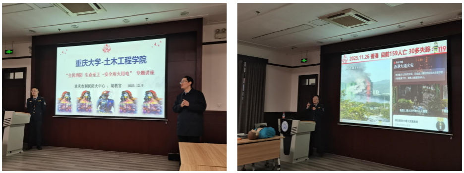 为贯彻“全民消防、生命至上”的安全理念,2025年12月9日上午,重庆大学土木工程实验中心在建工馆和第二综合楼举办了消防安全培训活动。活动邀请了重庆利民防火中心金牌教官胡云波授课。实验中心全体教师及土木工程学院师生代表近50人参加培训活动。