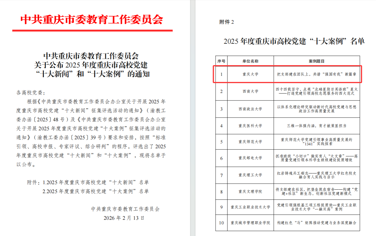 近日,中共重庆市委教育工作委员会发布了《关于公布2025年度重庆市高校党建“十大新闻”和“十大案例”的通知》。学院党委申报的《把支部建在团队上,共谱“强国有我”新篇章》成功入选“十大案例”。