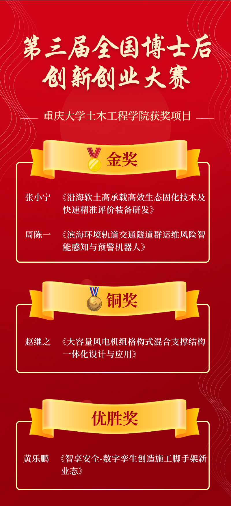10月28日,为期4天的第三届全国博士后创新创业大赛在福建泉州圆满闭幕。重庆大学土木工程学院代表队在本届大赛中表现突出,取得了2金1铜1优胜的好成绩,金奖和获奖数均创历史最佳成绩。