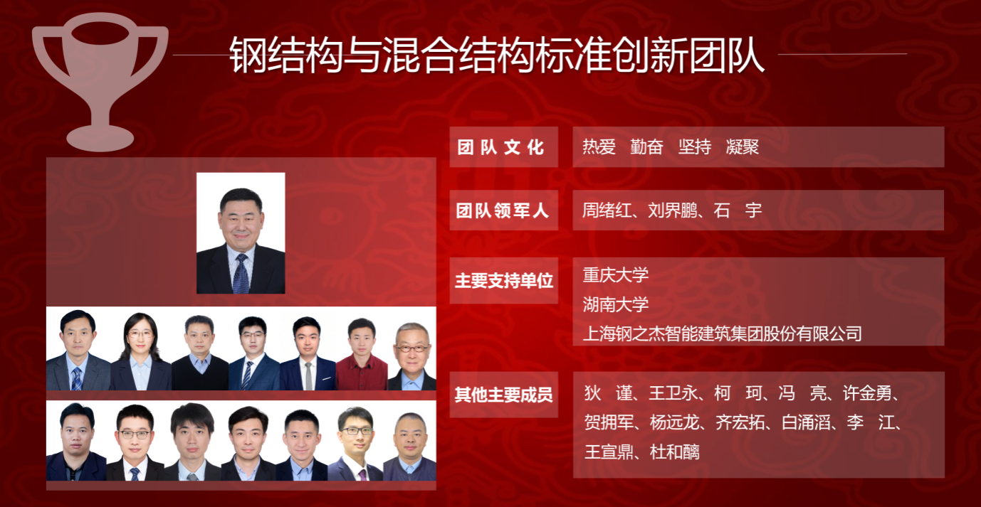在国家经济社会发展重大需求的牵引与国际前沿领域的引领下,周绪红院士牵头组建了一支老中青梯队合理、规模适度、素质优良的“钢结构与混合结构标准创新团队”,凝练形成了“热爱、勤奋、坚持、凝聚”的团队文化。团队由周绪红院士、刘界鹏和石宇教授领军,狄谨、王卫永、柯珂、冯亮、许金勇、贺拥军、杨远龙、齐宏拓、白涌滔、李江、王宣鼎和杜和醨等12位中青年骨干参与组成。