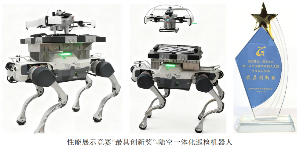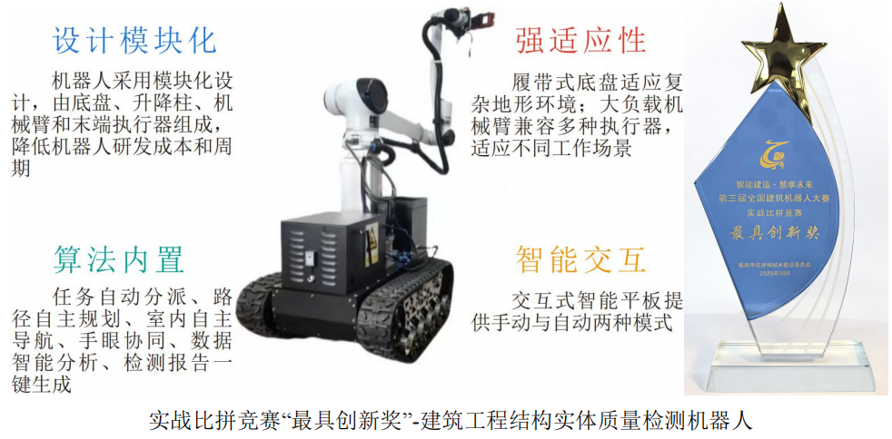 第三届全国建筑机器人大赛吸引了来自全国20余个省市的140家单位参与,共计339项创新成果亮相,参赛数量与质量均创历史新高,直接推动了智能制造与智能建造的深度融合发展。大赛设置实战比拼与性能展示等环节,聚焦工程测量、构件安装、质量检测、运维巡检等典型施工场景,重庆大学土木工程学院程国忠副教授积极参与,并在多项竞赛中取得成绩:①联合北京中铁建建筑科技有限公司自主研发的“建筑工程结构实体质量检测机器人”在实战比拼竞赛中获“最具创新奖”;②联合广州一建建设集团有限公司自主开发的“陆空一体化巡检机器人”在性能展示竞赛中获“最具创新奖”;③联合中电建铁路建设投资集团重庆有限公司自主开发的“装配式工程智能施工装备与系统”在性能展示竞赛中获“最具潜力奖”。