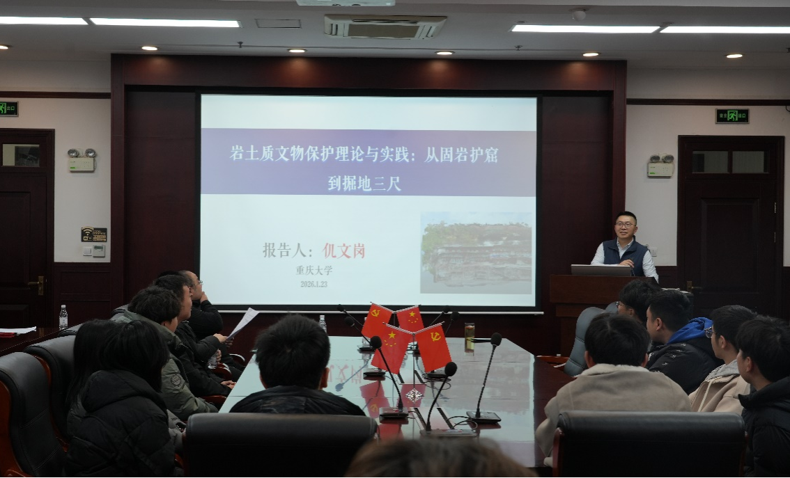 仉文岗从“文物古迹—馆藏文物”的视角切入,系统阐释了石窟寺、摩崖造像等文化遗产的材料劣化机制、病害精准识别技术及针对性保护方案。他以“钓鱼城加担土遗址”为例,详细拆解了夯土结构力学特性研究的技术路径、数据获取方法与分析逻辑,同步展示了砂岩断裂机理及裂隙演化的最新研究进展,完整呈现了从理论探索到实践应用的科研全链条,为师生搭建起理论与实践对接的桥梁。