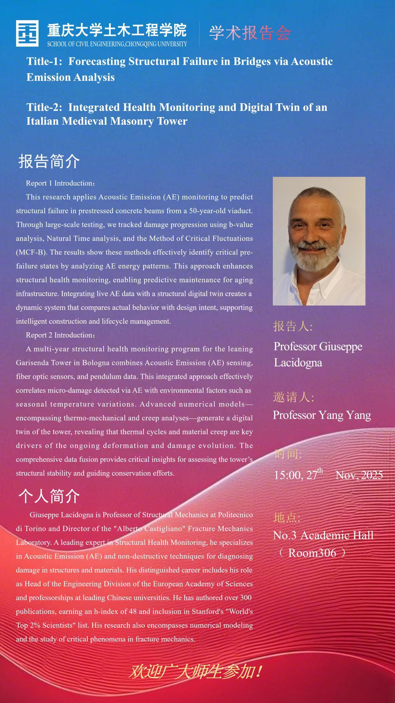 【学术报告】Title-1: Forecasting Structural Failure in Bridges via Acoustic Emission Analysis & Title-2: Integrated Health Monitoring and Digital Twin of an Italian Medieval Masonry Tower