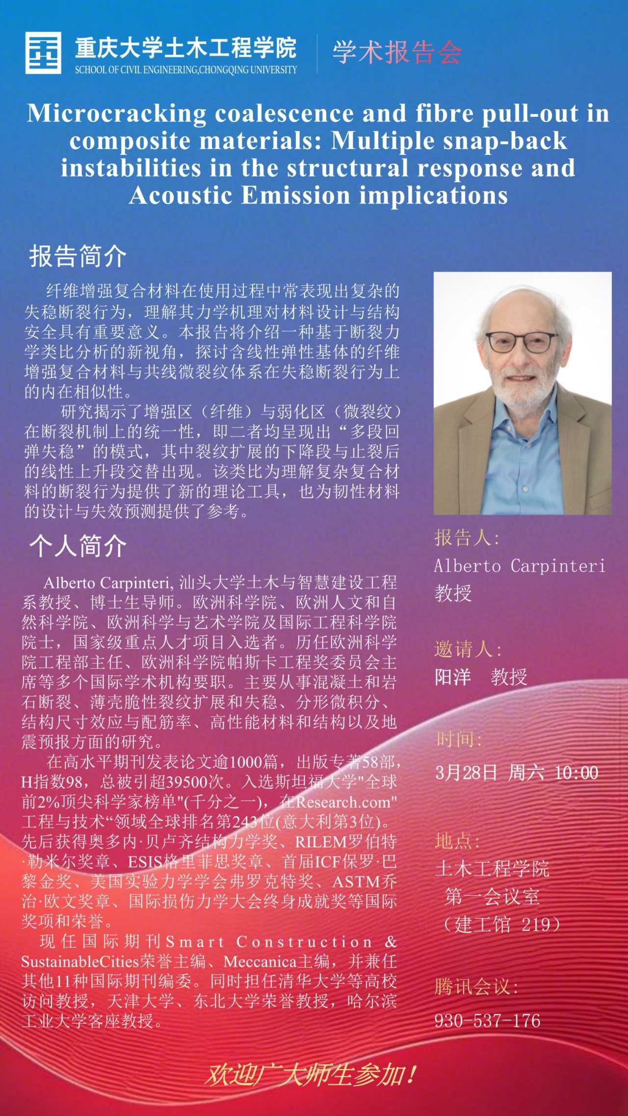 【学术报告】Microcracking coalescence and fibre pull-out in composite materials: Multiple snap-back instabilities in the structural response and Acoustic Emission implications